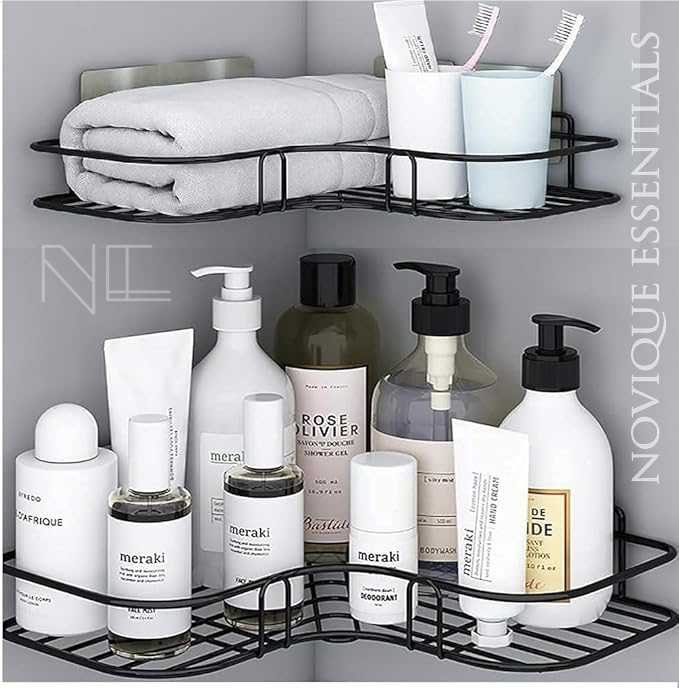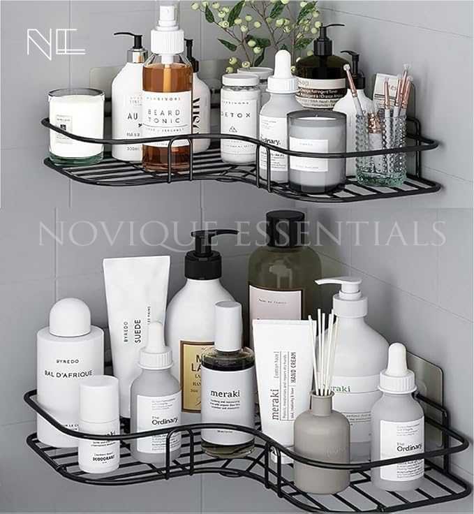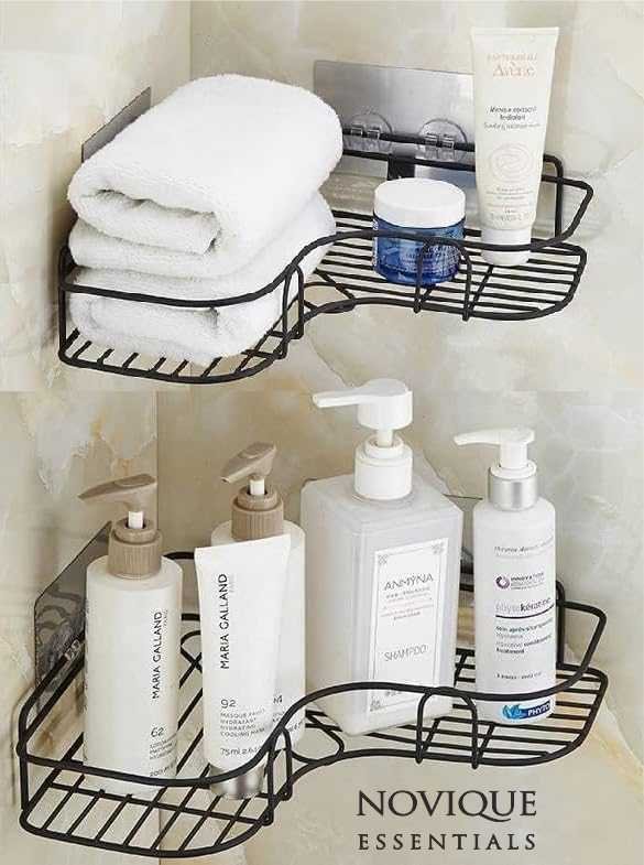 • NO DRILL INSTALLATION: Strong adhesive makes it a perfect bathroom organizer without drill and reliable self adhesive wall shelf.